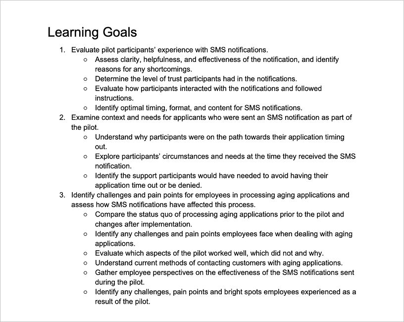 I created a research plan that clarified the problem space, research questions, and decision points the pilot needed to inform. This included defining learning goals around applicant comprehension, response behavior, and operational impact, as well as drafting interview and usability testing guides to support each phase of research.